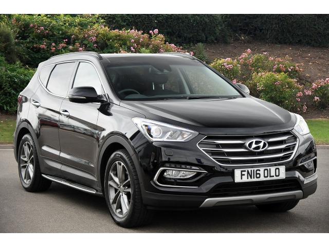This vehicle is a 16 Hyundai Santa Fe 2.2 Crdi Blue Drive Premium Se 5Dr Auto [7 Seats] Diesel Estate in Pearl - Phantom Black with 5 doors.