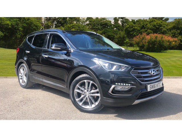 This vehicle is a 16 Hyundai Santa Fe 2.2 Crdi Blue Drive Premium Se 5Dr Auto [7 Seats] Diesel Estate in Phantom Black - Pearl with 5 doors.