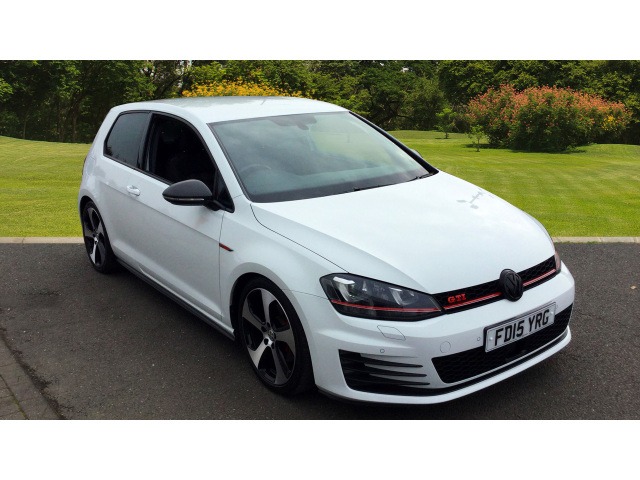 This vehicle is a 15 Volkswagen Golf 2.0 Tsi Gti 3Dr Dsg Petrol Hatchback in Pure White with 3 doors.